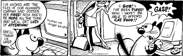 Human: 'Sob! I've been fired! Now I won't be able to afford to