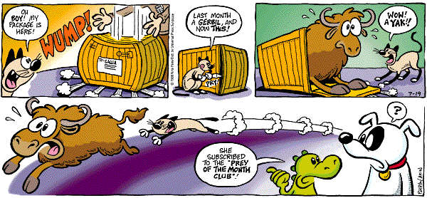 Panel 2: The box is on its side and a smallish yak is emerging,